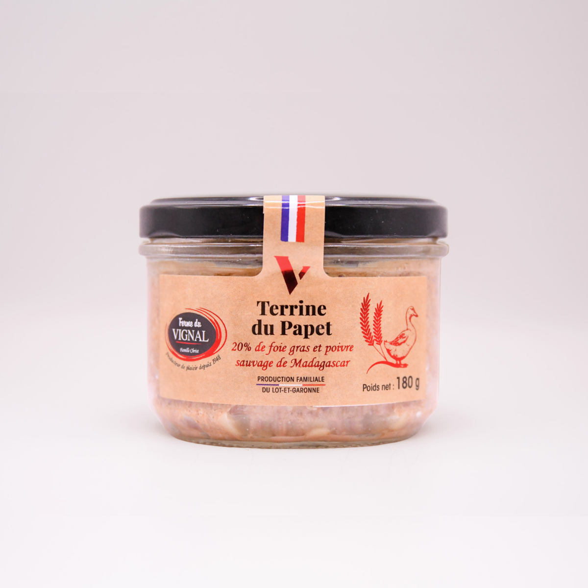 Le Pâté du Papet est une recette maison, transmise et affinée chez nous. Il marie une base de viande de porc et de canard avec 20 % de foie gras de canard, relevée d’un poivre sauvage de Madagascar aux arômes boisés et délicats.