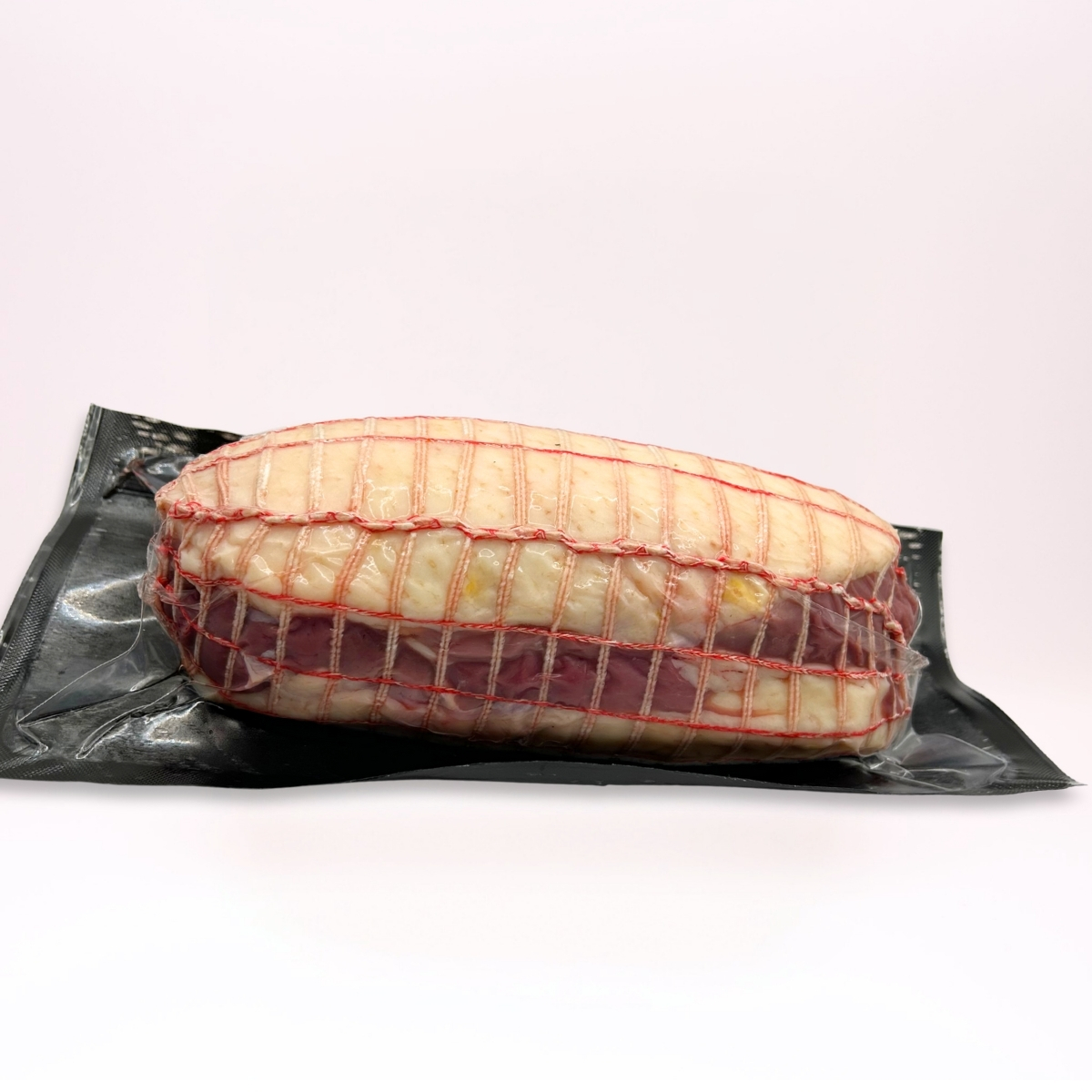 Le plus raffiné de nos rôtis. Deux magrets farcis d’un cœur de foie gras de canard (environ 15%), puis ficelés à la main pour une cuisson homogène.